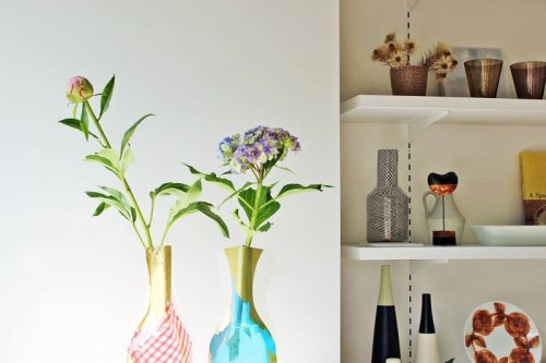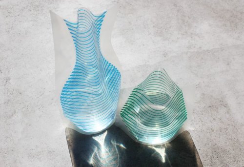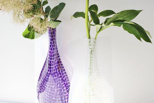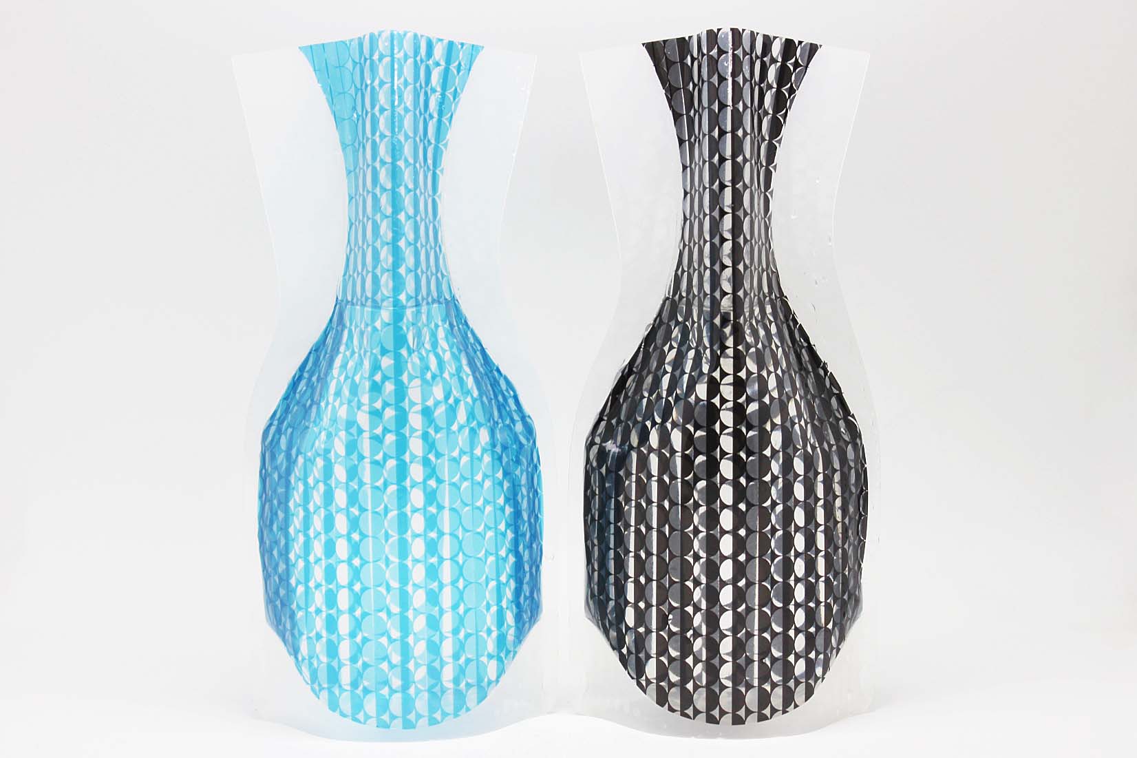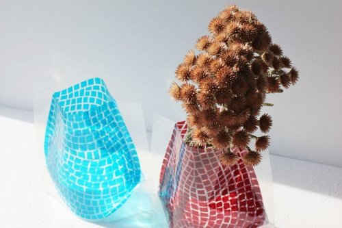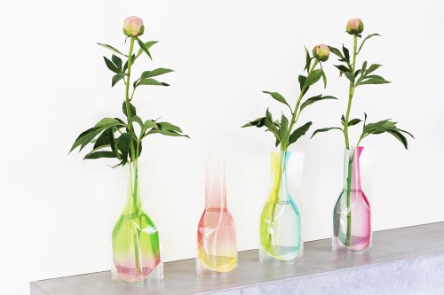 洗剤の詰め替え用パックからアイデアを得た花瓶は、水を入れると立体になりしかっりとした安定感を保ちます。グラフィックデザイナーから生まれる色とりどりの柄はどれも洗練されいて、水を入れた時の見え方がしっかり計算されています。さすがだな、と思うのは柄のデザインだけではありません。立体になった時の形です。花を2〜3本挿せば様になるような、シンプルだけど飽きのこない形。ガラスの花瓶と見間違えるのは、この美しさにも理由があるのではないでしょうか。