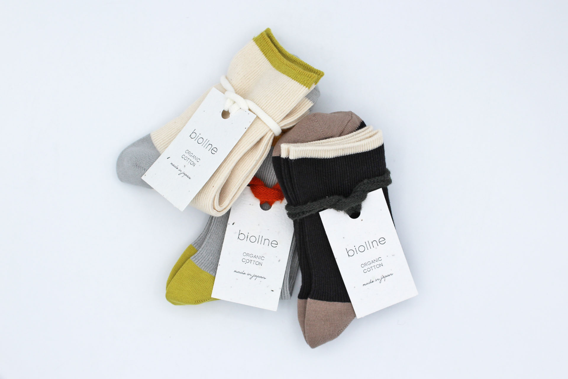 オーガニックコットン糸使用の、さらりとした質感の靴下。窮屈さやズレは感じにくく、軽い履き心地です。つま先、かかと、口ゴム部分に配色を施した楽しいデザイン。長いシーズン重宝するアイテムです。