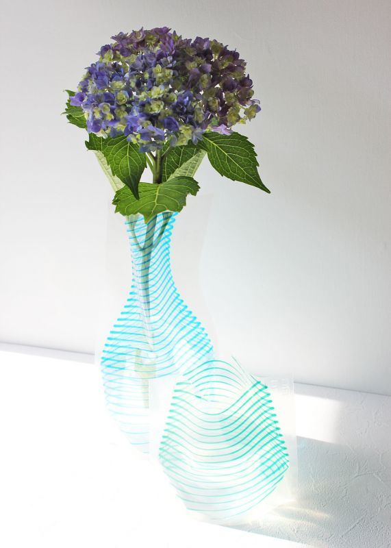 洗剤の詰め替え用パックからアイデアを得た花瓶は、水を入れると立体になりしかっりとした安定感を保ちます。グラフィックデザイナーから生まれる色とりどりの柄はどれも洗練されいて、水を入れた時の見え方がしっかり計算されています。さすがだな、と思うのは柄のデザインだけではありません。立体になった時の形です。花を2〜3本挿せば様になるような、シンプルだけど飽きのこない形。ガラスの花瓶と見間違えるのは、この美しさにも理由があるのではないでしょうか。
